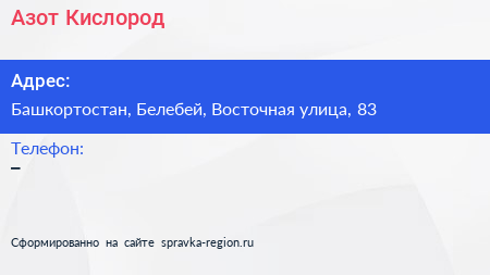 Азот-Кислород по адресу Башкортостан, Белебей, Восточная улица, 83 в дальнейшем Организация, размещена в следующих категориях: