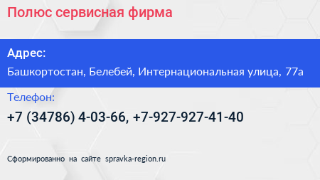 Полюс, сервисная фирма по адресу Башкортостан, Белебей, Интернациональная улица, 77а в дальнейшем Организация, размещена в следующих категориях: