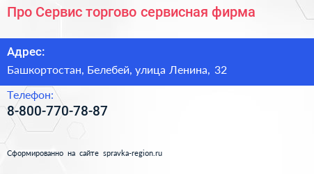 Про-Сервис, торгово-сервисная фирма по адресу Башкортостан, Белебей, улица Ленина, 32 в дальнейшем Организация, размещена в следующих категориях: