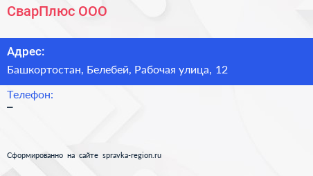 СварПлюс, ООО по адресу Башкортостан, Белебей, Рабочая улица, 12 в дальнейшем Организация, размещена в следующих категориях: