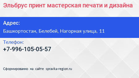 Эльбрус-принт, мастерская печати и дизайна по адресу Башкортостан, Белебей, Нагорная улица, 11 в дальнейшем Организация, размещена в следующих категориях: