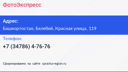 ФотоЭкспресс по адресу Башкортостан, Белебей, Красная улица, 119 в дальнейшем Организация, размещена в следующих категориях: