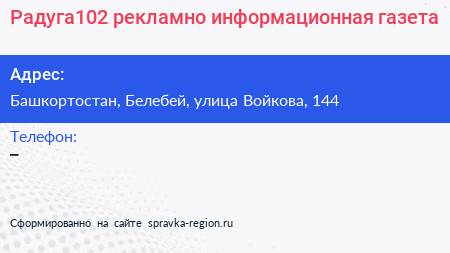 Радуга102, рекламно-информационная газета по адресу Башкортостан, Белебей, улица Войкова, 144 в дальнейшем Организация, размещена в следующих категориях: