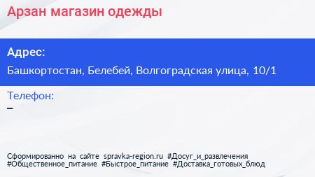 Арзан, магазин одежды по адресу Башкортостан, Белебей, Волгоградская улица, 10/1 в дальнейшем Организация, размещена в следующих категориях: