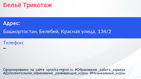 Бельё Трикотаж по адресу Башкортостан, Белебей, Красная улица, 134/2 в дальнейшем Организация, размещена в следующих категориях: