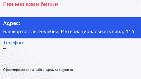 Ева, магазин белья по адресу Башкортостан, Белебей, Интернациональная улица, 116 в дальнейшем Организация, размещена в следующих категориях: