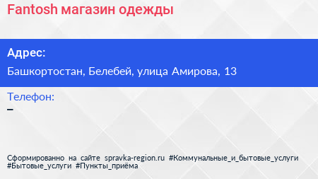 Fantosh, магазин одежды по адресу Башкортостан, Белебей, улица Амирова, 13 в дальнейшем Организация, размещена в следующих категориях:
