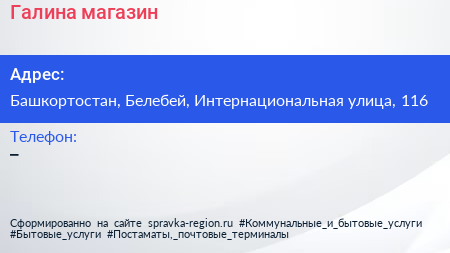 Галина, магазин по адресу Башкортостан, Белебей, Интернациональная улица, 116 в дальнейшем Организация, размещена в следующих категориях:
