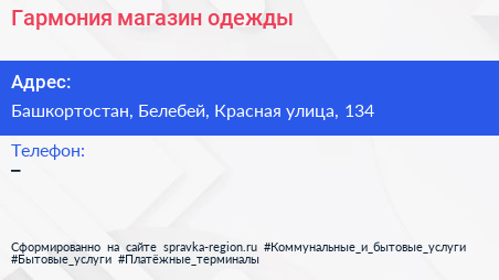 Гармония, магазин одежды по адресу Башкортостан, Белебей, Красная улица, 134 в дальнейшем Организация, размещена в следующих категориях: