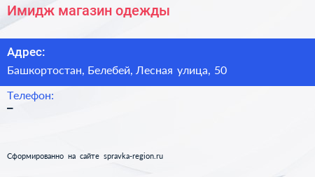 Имидж, магазин одежды по адресу Башкортостан, Белебей, Лесная улица, 50 в дальнейшем Организация, размещена в следующих категориях: