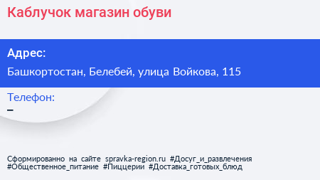 Каблучок, магазин обуви по адресу Башкортостан, Белебей, улица Войкова, 115 в дальнейшем Организация, размещена в следующих категориях: