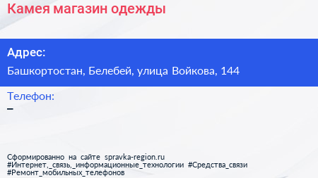 Камея, магазин одежды по адресу Башкортостан, Белебей, улица Войкова, 144 в дальнейшем Организация, размещена в следующих категориях: