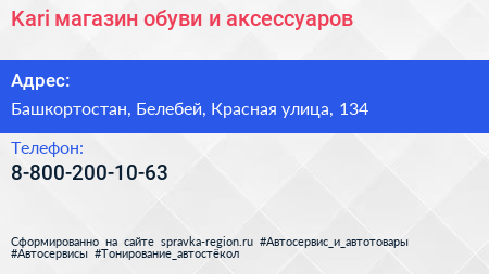 Kari, магазин обуви и аксессуаров по адресу Башкортостан, Белебей, Красная улица, 134 в дальнейшем Организация, размещена в следующих категориях: