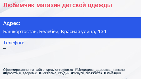 Любимчик, магазин детской одежды по адресу Башкортостан, Белебей, Красная улица, 134 в дальнейшем Организация, размещена в следующих категориях: