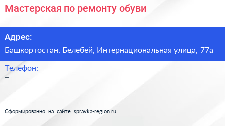 Мастерская по ремонту обуви по адресу Башкортостан, Белебей, Интернациональная улица, 77а в дальнейшем Организация, размещена в следующих категориях: