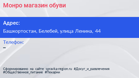 Монро, магазин обуви по адресу Башкортостан, Белебей, улица Ленина, 44 в дальнейшем Организация, размещена в следующих категориях: