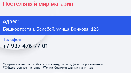 Постельный мир, магазин по адресу Башкортостан, Белебей, улица Войкова, 123 в дальнейшем Организация, размещена в следующих категориях: