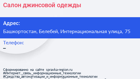 Салон джинсовой одежды по адресу Башкортостан, Белебей, Интернациональная улица, 75 в дальнейшем Организация, размещена в следующих категориях: