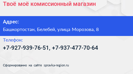 Твоё моё, комиссионный магазин по адресу Башкортостан, Белебей, улица Морозова, 8 в дальнейшем Организация, размещена в следующих категориях: