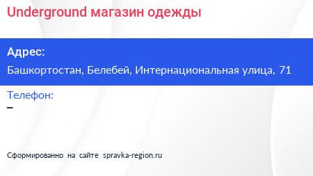 Underground, магазин одежды по адресу Башкортостан, Белебей, Интернациональная улица, 71 в дальнейшем Организация, размещена в следующих категориях: