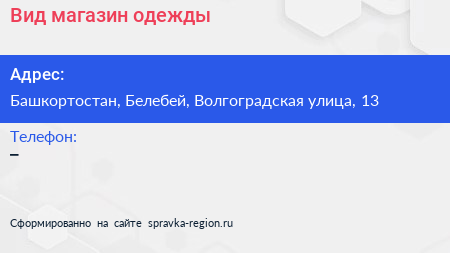 Вид, магазин одежды по адресу Башкортостан, Белебей, Волгоградская улица, 13 в дальнейшем Организация, размещена в следующих категориях: