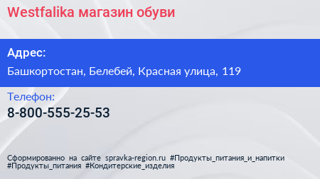 Westfalika, магазин обуви по адресу Башкортостан, Белебей, Красная улица, 119 в дальнейшем Организация, размещена в следующих категориях: