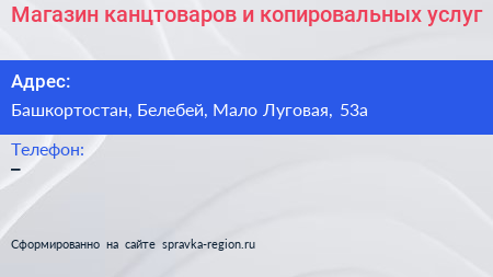 Магазин канцтоваров и копировальных услуг по адресу Башкортостан, Белебей, Мало Луговая, 53а в дальнейшем Организация, размещена в следующих категориях: