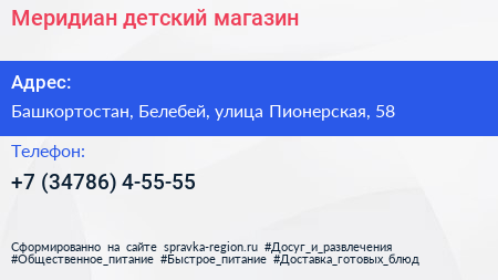 Меридиан, детский магазин по адресу Башкортостан, Белебей, улица Пионерская, 58 в дальнейшем Организация, размещена в следующих категориях: