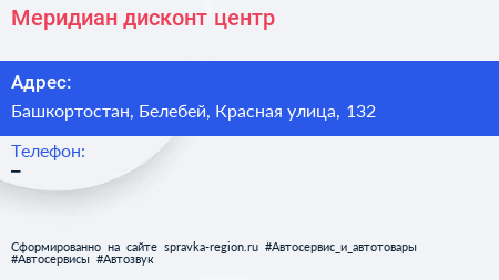 Меридиан, дисконт-центр по адресу Башкортостан, Белебей, Красная улица, 132 в дальнейшем Организация, размещена в следующих категориях: