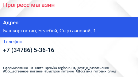 Прогресс, магазин по адресу Башкортостан, Белебей, Сыртлановой, 1 в дальнейшем Организация, размещена в следующих категориях: