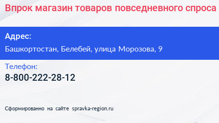 Впрок, магазин товаров повседневного спроса по адресу Башкортостан, Белебей, улица Морозова, 9 в дальнейшем Организация, размещена в следующих категориях: