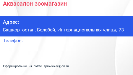 Аквасалон, зоомагазин по адресу Башкортостан, Белебей, Интернациональная улица, 73 в дальнейшем Организация, размещена в следующих категориях: