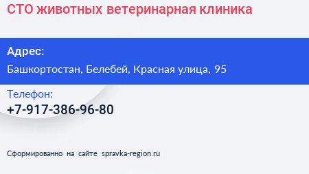 СТО животных, ветеринарная клиника по адресу Башкортостан, Белебей, Красная улица, 95 в дальнейшем Организация, размещена в следующих категориях: