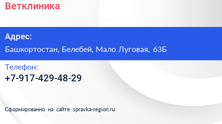 Ветклиника по адресу Башкортостан, Белебей, Мало Луговая, 63Б в дальнейшем Организация, размещена в следующих категориях: