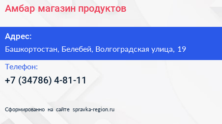 Амбар, магазин продуктов по адресу Башкортостан, Белебей, Волгоградская улица, 19 в дальнейшем Организация, размещена в следующих категориях: