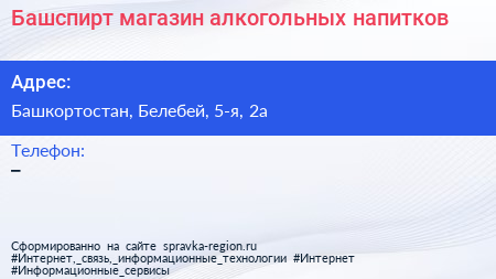 Башспирт, магазин алкогольных напитков по адресу Башкортостан, Белебей, 5-я, 2а в дальнейшем Организация, размещена в следующих категориях: