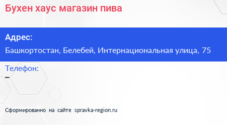 Бухен хаус, магазин пива по адресу Башкортостан, Белебей, Интернациональная улица, 75 в дальнейшем Организация, размещена в следующих категориях: