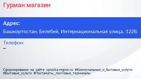Гурман, магазин по адресу Башкортостан, Белебей, Интернациональная улица, 122Б в дальнейшем Организация, размещена в следующих категориях: