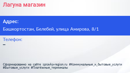 Лагуна, магазин по адресу Башкортостан, Белебей, улица Амирова, 8/1 в дальнейшем Организация, размещена в следующих категориях: