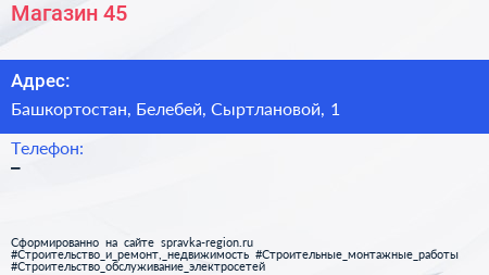 Магазин №45 по адресу Башкортостан, Белебей, Сыртлановой, 1 в дальнейшем Организация, размещена в следующих категориях: