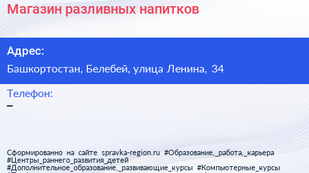Магазин разливных напитков по адресу Башкортостан, Белебей, улица Ленина, 34 в дальнейшем Организация, размещена в следующих категориях:
