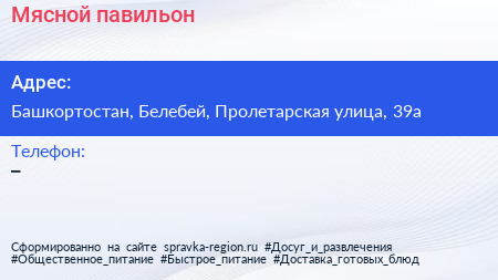 Мясной павильон по адресу Башкортостан, Белебей, Пролетарская улица, 39а в дальнейшем Организация, размещена в следующих категориях: