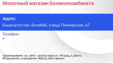 Молочный магазин Белмолкомбината по адресу Башкортостан, Белебей, улица Пионерская, 67 в дальнейшем Организация, размещена в следующих категориях: