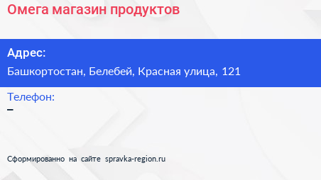 Омега, магазин продуктов по адресу Башкортостан, Белебей, Красная улица, 121 в дальнейшем Организация, размещена в следующих категориях: