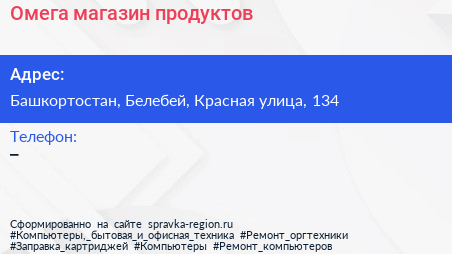 Омега, магазин продуктов по адресу Башкортостан, Белебей, Красная улица, 134 в дальнейшем Организация, размещена в следующих категориях: