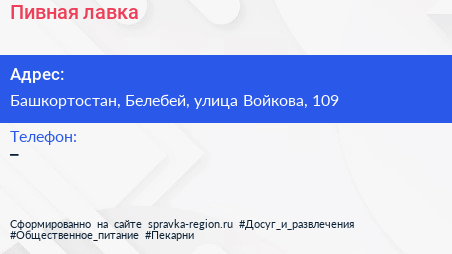 Пивная лавка по адресу Башкортостан, Белебей, улица Войкова, 109 в дальнейшем Организация, размещена в следующих категориях: