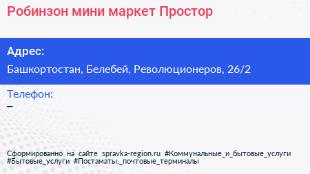 Робинзон, мини-маркет Простор по адресу Башкортостан, Белебей, Революционеров, 26/2 в дальнейшем Организация, размещена в следующих категориях: