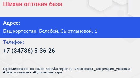 Шихан, оптовая база по адресу Башкортостан, Белебей, Сыртлановой, 1 в дальнейшем Организация, размещена в следующих категориях: