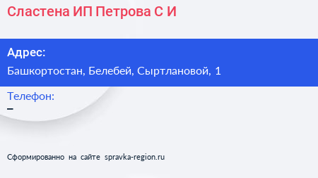 Сластена, ИП Петрова С.И. по адресу Башкортостан, Белебей, Сыртлановой, 1 в дальнейшем Организация, размещена в следующих категориях: