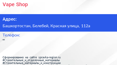 Vape Shop по адресу Башкортостан, Белебей, Красная улица, 112а в дальнейшем Организация, размещена в следующих категориях: